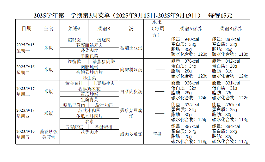2025学年第一学期第3周菜单(2025年9月15日-2025年9月19日)