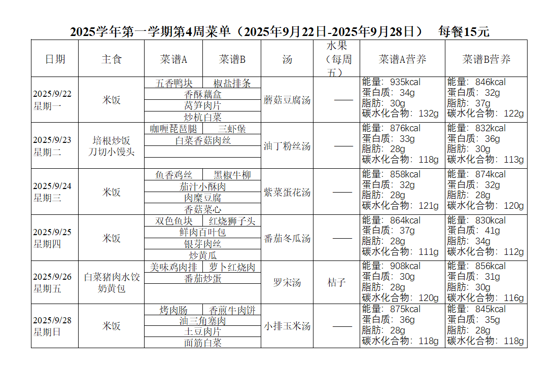 2025学年第一学期第4周菜单(2025年9月22日-2025年9月28日)