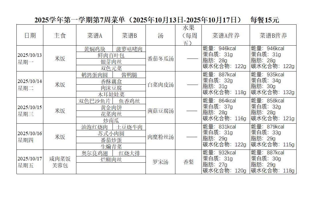 2025学年第一学期第7周菜单(2025年10月13日-2025年10月17日)