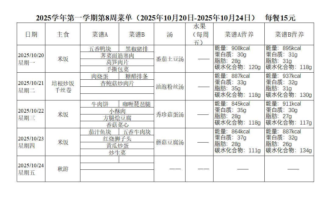 2025学年第一学期第8周菜单(2025年10月20日-2025年10月24日)