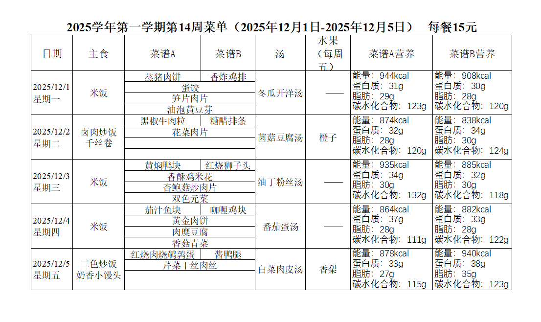2025学年第一学期第14周菜单(2025年12月1日-2025年12月5日)
