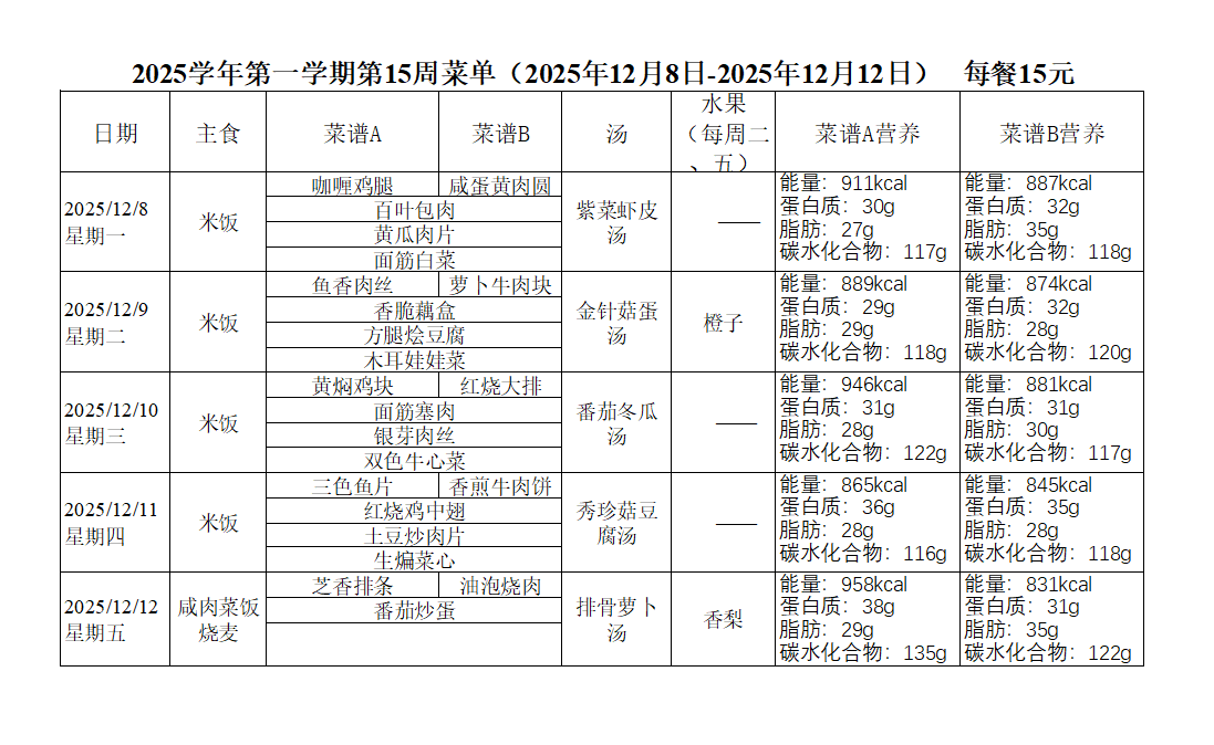 2025学年第一学期第15周菜单(2025年12月8日-2025年12月12日)