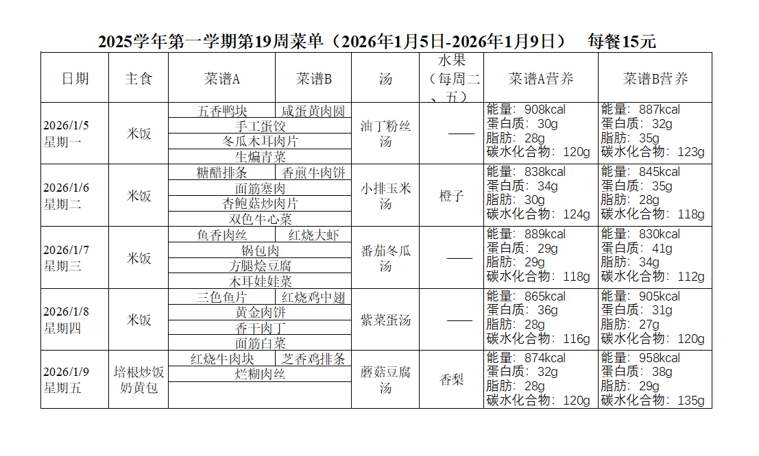 2025学年第一学期第19周菜单(2026年1月5日-2026年1月9日)