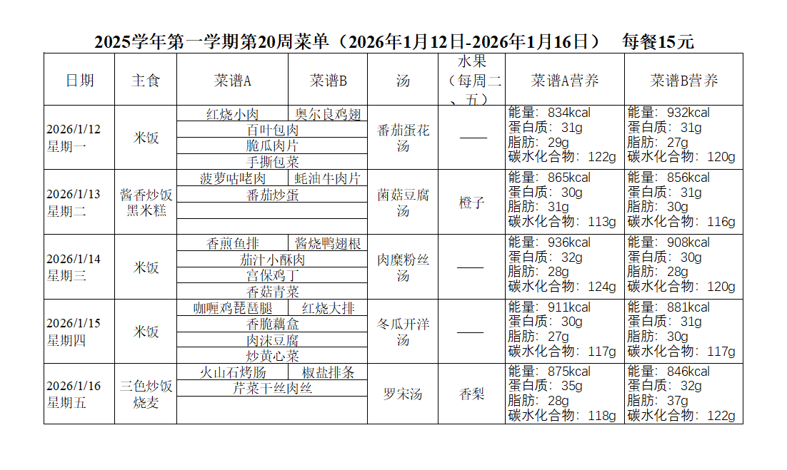 2025学年第一学期第20周菜单(2026年1月12日-2026年1月16日)