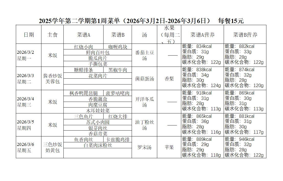 2025学年第二学期第1周菜单(2026年3月2日-2026年3月6日)