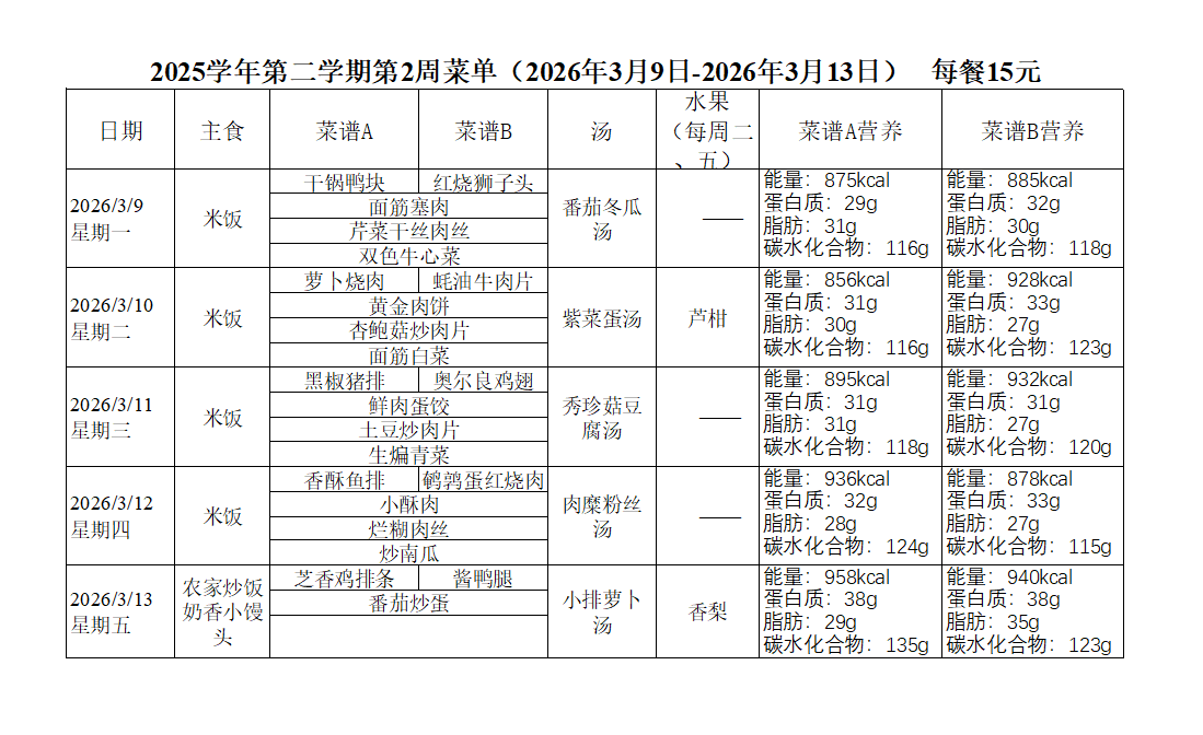 2025学年第二学期第2周菜单(2026年3月9日-2026年3月13日)